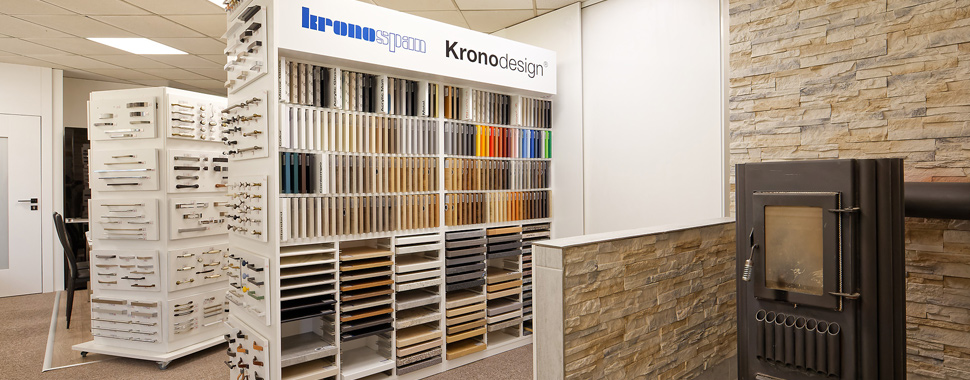 Vystaveny jsou kompletní vzorkovníky plošného materiálu zn. Egger a Kronospan, foliovaná dvířka Hefas, Grena a Trachea, úchytky Siro, Tulip, Eko-Interiér, zásuvky, průchodky, stolové nohy, sortery, příborníky, potravinové skříně, výsuvné a otočné systémy kuchyňských skříněk.