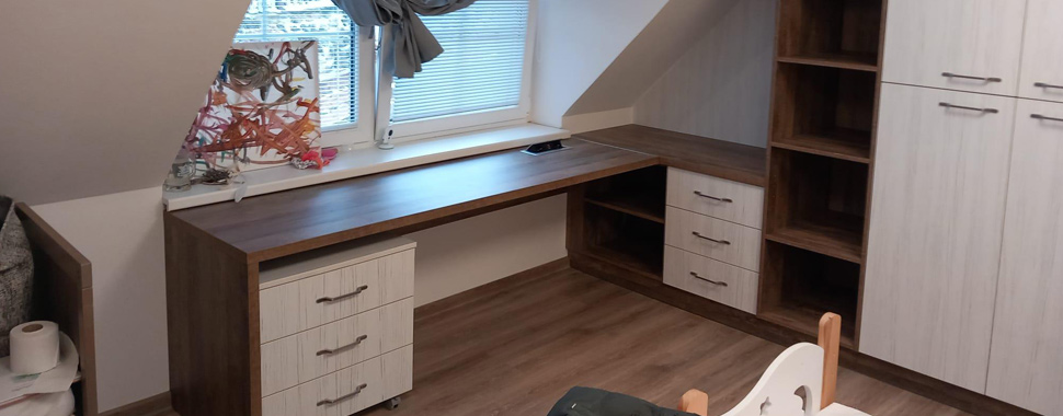 Kdo jiný než naši nejmenší potřebují péči a kvalitu na míru, kterou vám garantujeme díky trvanlivému certifikovanému laminu v široké škále dekorů a barev. Při zařizování dětského nebo studentského pokoje je nutné myslet na celkové uspořádání místnosti, dostatek úložných prostorů i na kvalitu osvětlení. Ideální pokoj musí dětem nabídnout vhodný prostor pro hru, zábavu i práci.